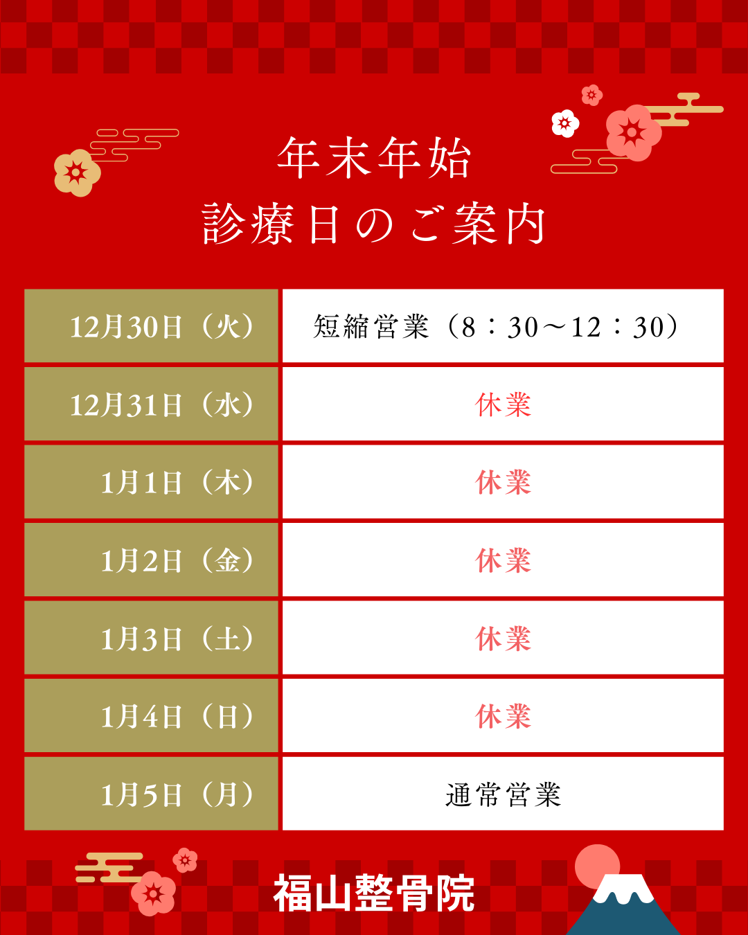 【年末年始のご案内】-交通事故でお悩みなら福山整骨院へー