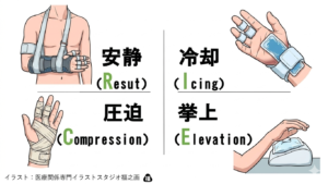 突き指をして「青くなってきた!」と気づいたその瞬間に、どれだけ早く適切な処置ができるかで、その後の治りの早さが決まります。スポーツ医学でも基本とされる「RICE(ライス)処置」を必ず行いましょう。