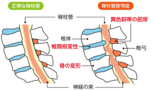 仕組み: 加齢に伴い、神経の通り道である「脊柱管」が骨の変形や靭帯の肥厚によって狭くなります。