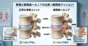 仕組み: 背骨の間にあるクッション(椎間板)が飛び出し、神経を直接圧迫します。